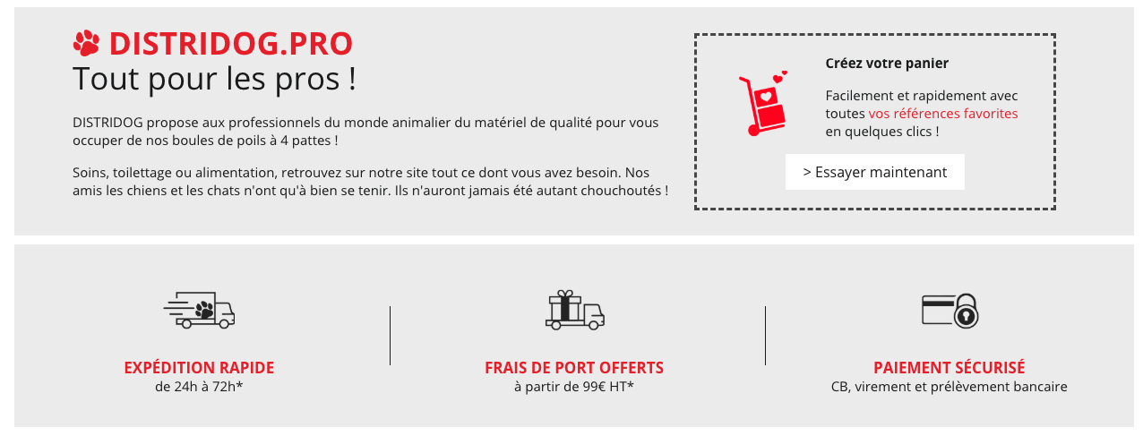 • Promesses logistiques claires : expédition 24–72 h, franco à partir de 99 € HT et paiements sécurisés (CB, virement, prélèvement) affichés dès la page d’accueil pour rassurer et accélérer la décision.