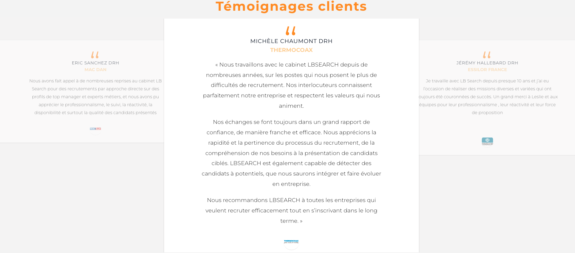 La structure du site a été pensée pour mettre en avant les points forts de LB Search : son expertise, ses valeurs, ses témoignages et ses secteurs d’intervention.