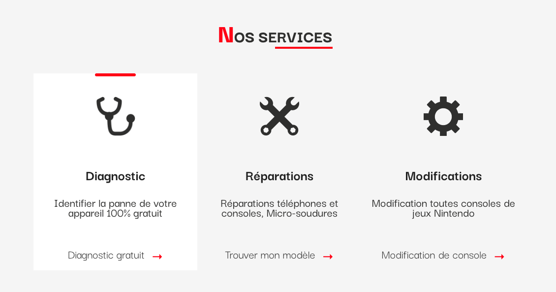 Le site met en avant les deux axes clés de l’activité : la vente de consoles et la réparation avec diagnostic gratuit en ligne, première étape pratique et sans engagement pour les clients.