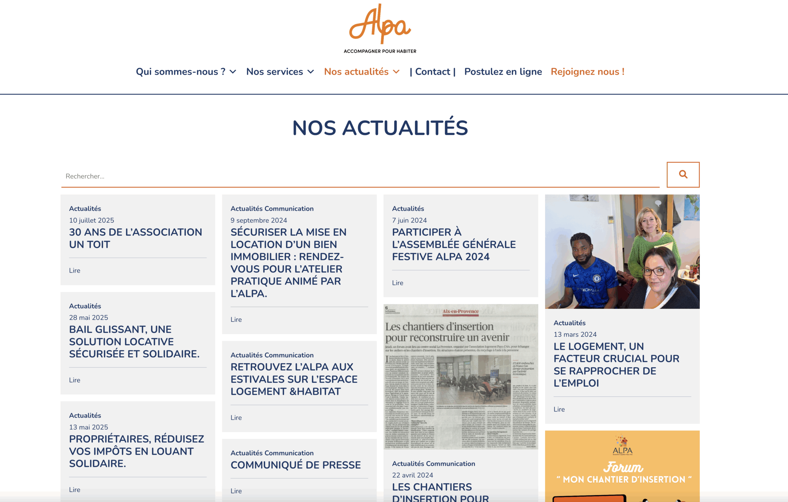 Nous avons conçu un site vitrine sous WordPress, pensé pour être simple d’utilisation et permettre à l’équipe de l’ALPA de gérer son contenu en toute autonomie.